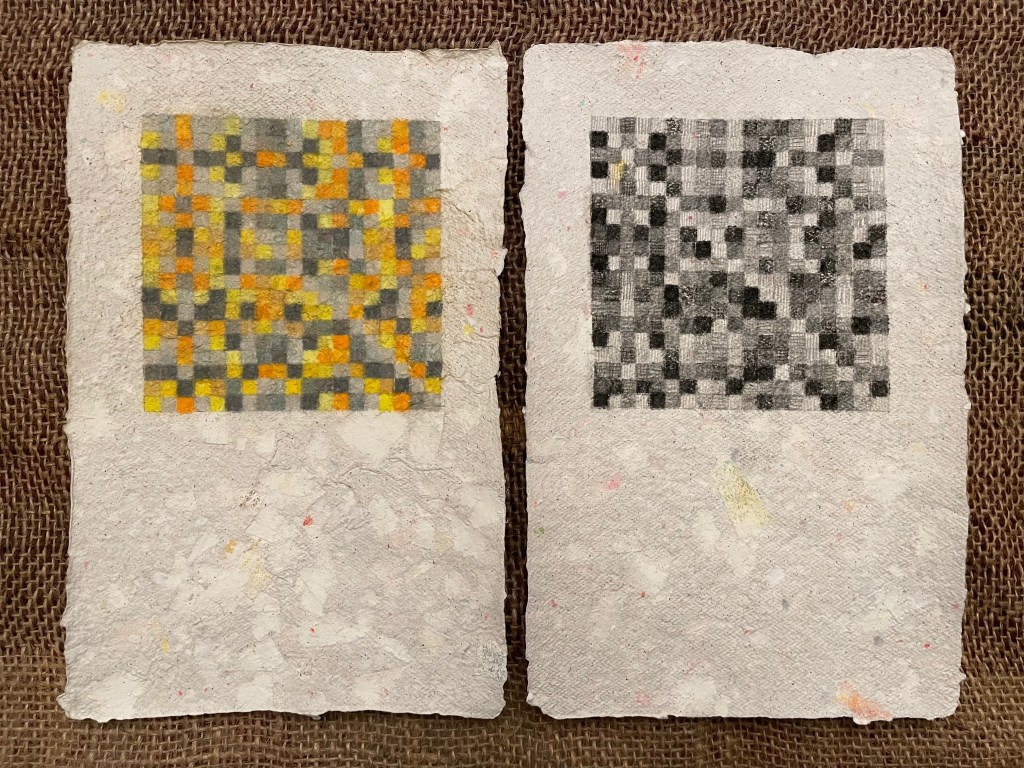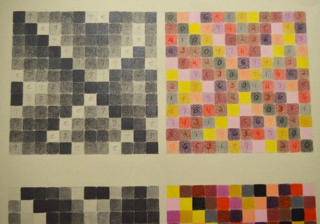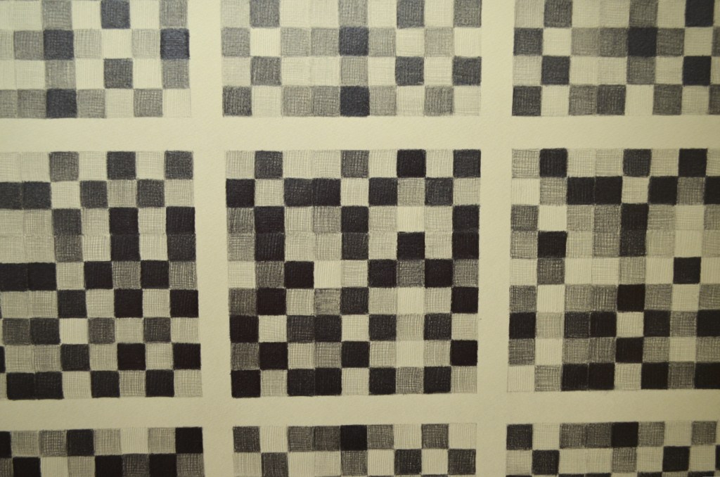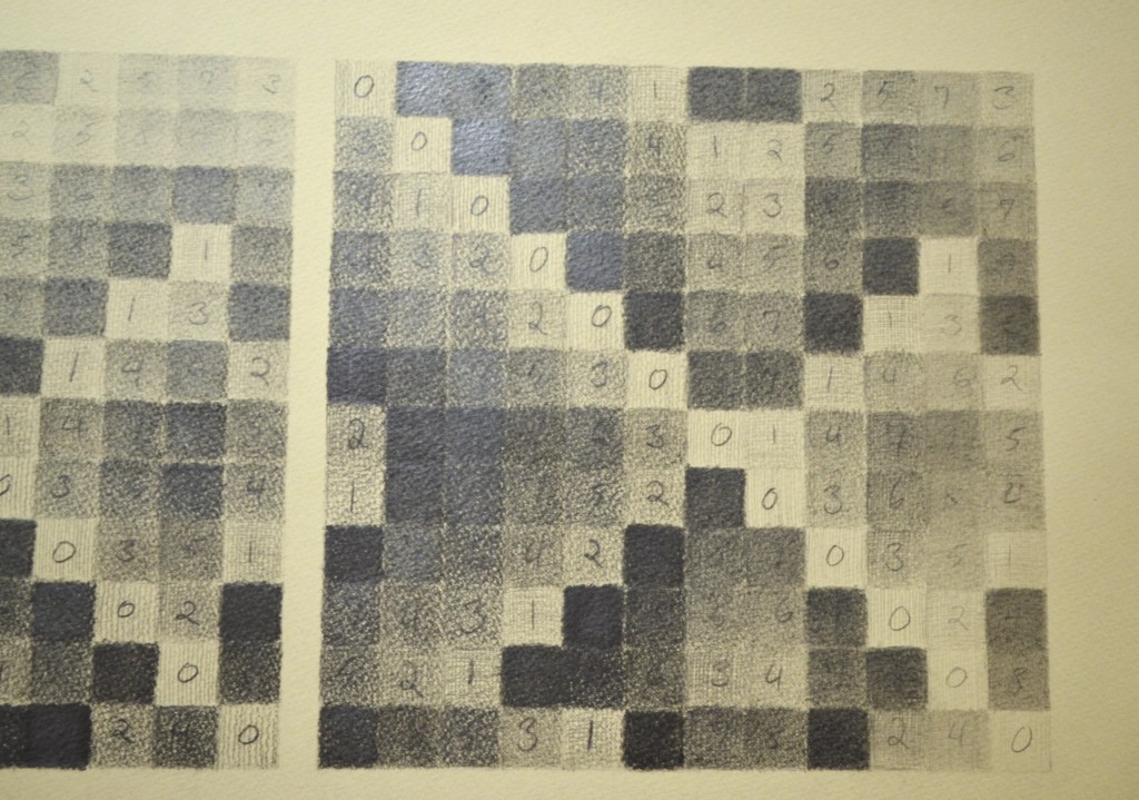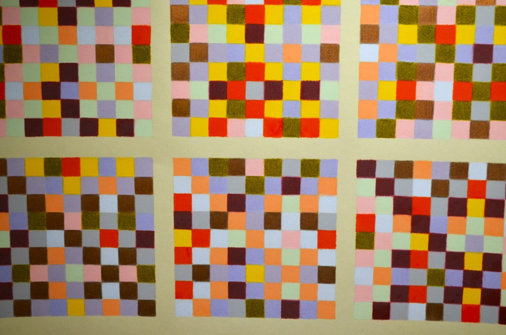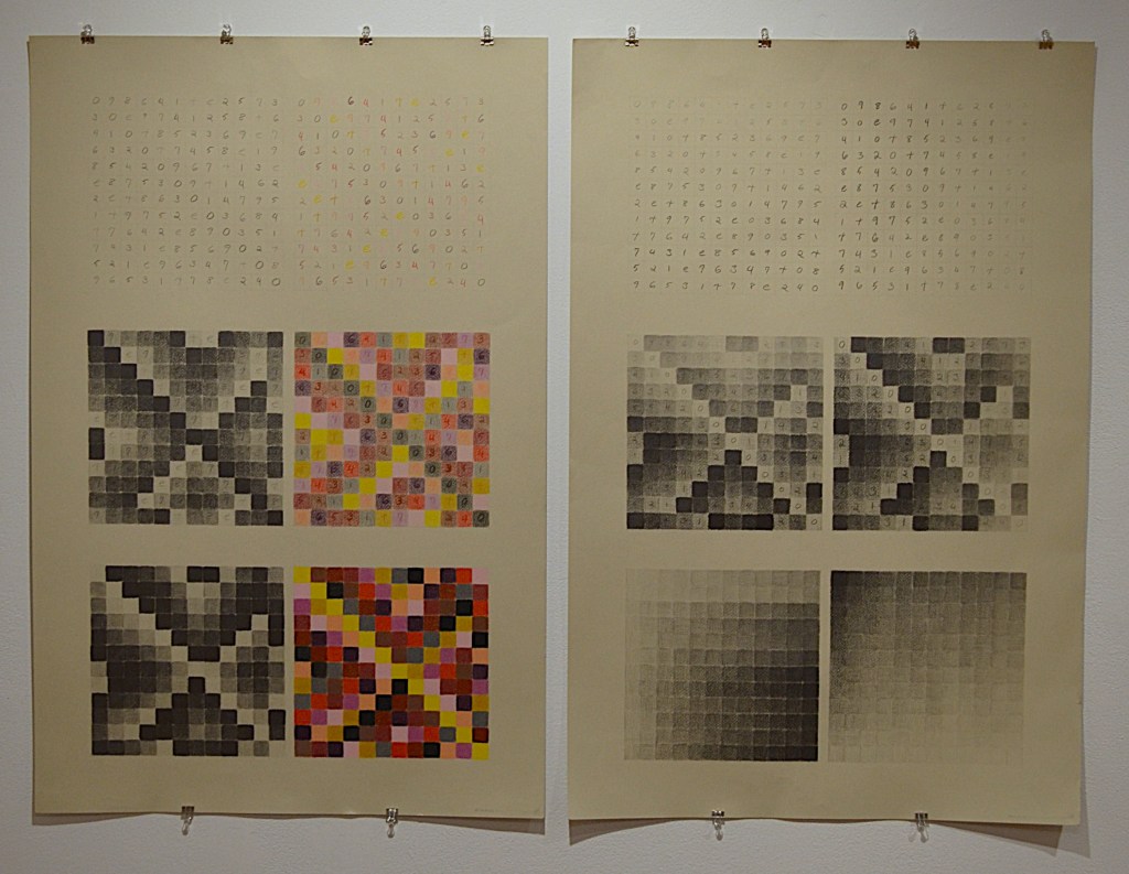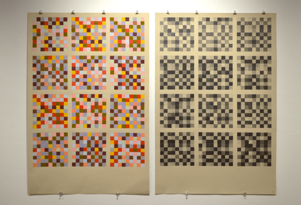 The diptych series uses matrices from twelve tone serial composition (a classical music technique developed by Arnold Schoenberg) to generate grid-based patterns from melodies. Each shaded or coloured square represents a musical pitch, the top horizontal line of which is the original melody’s sequence.
