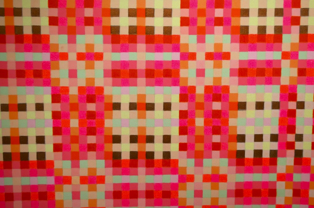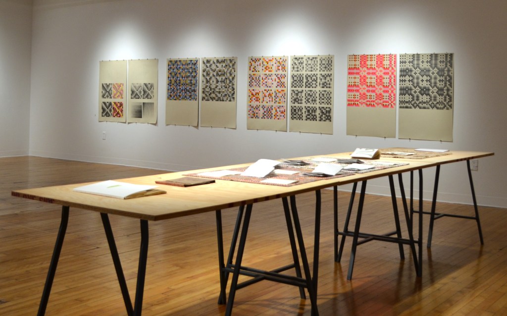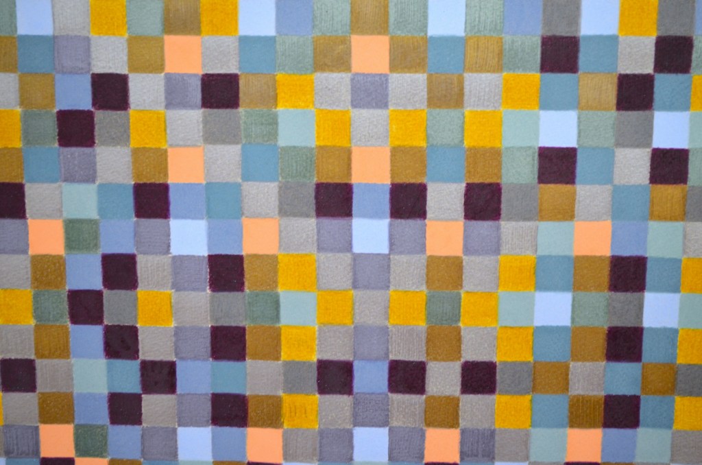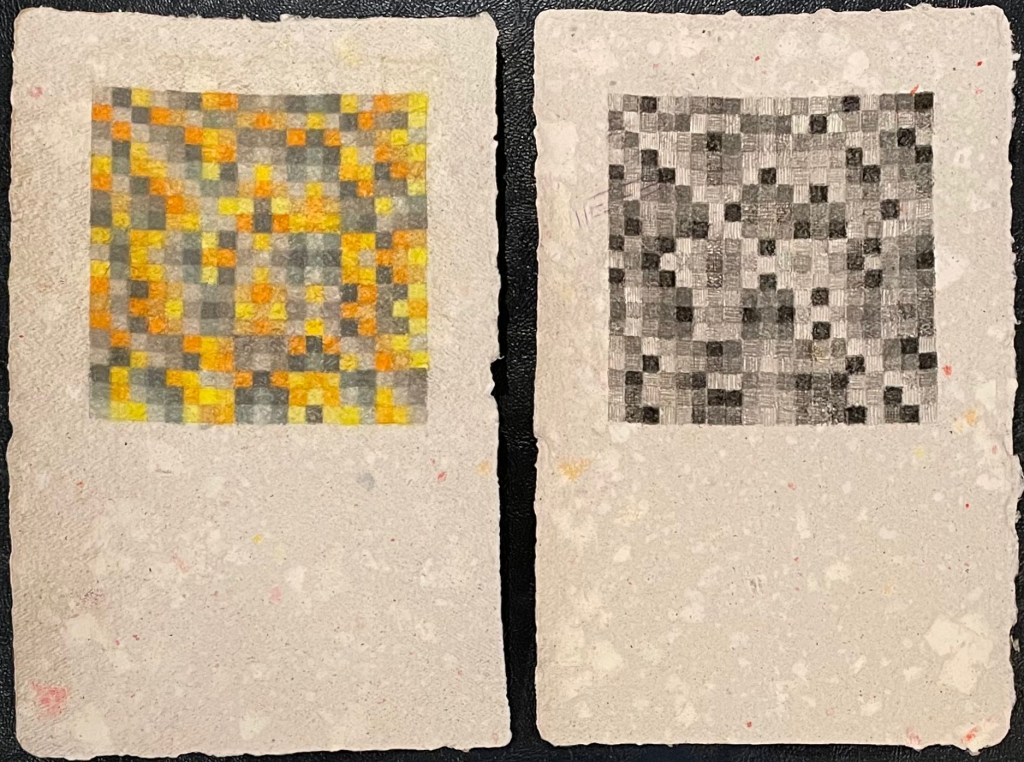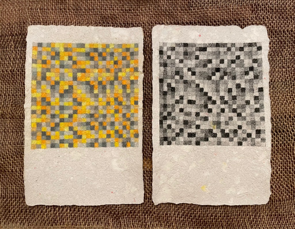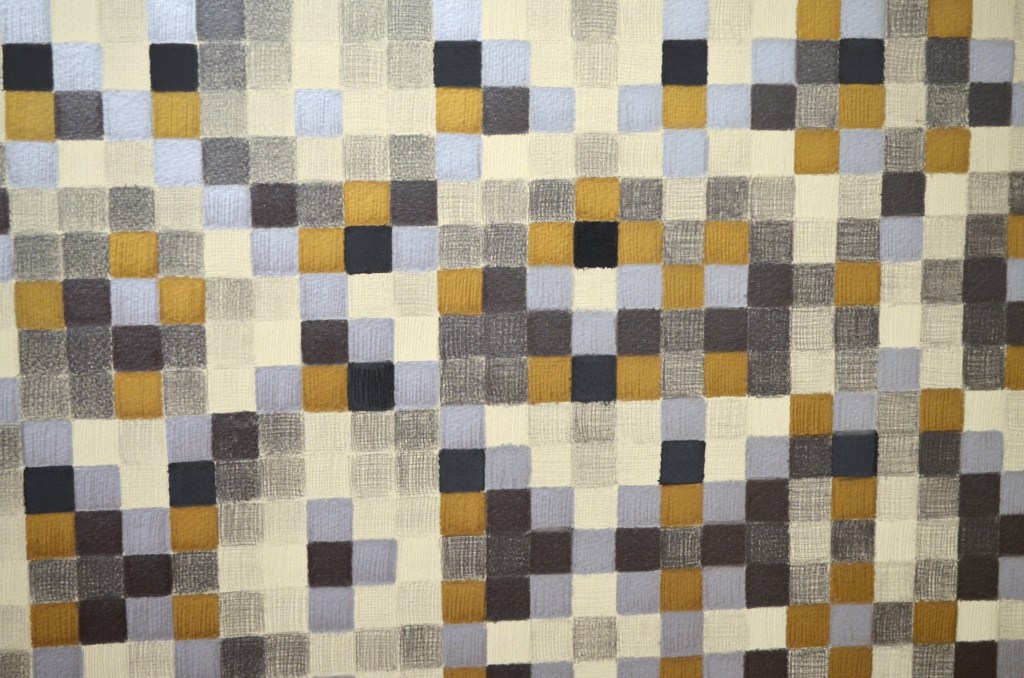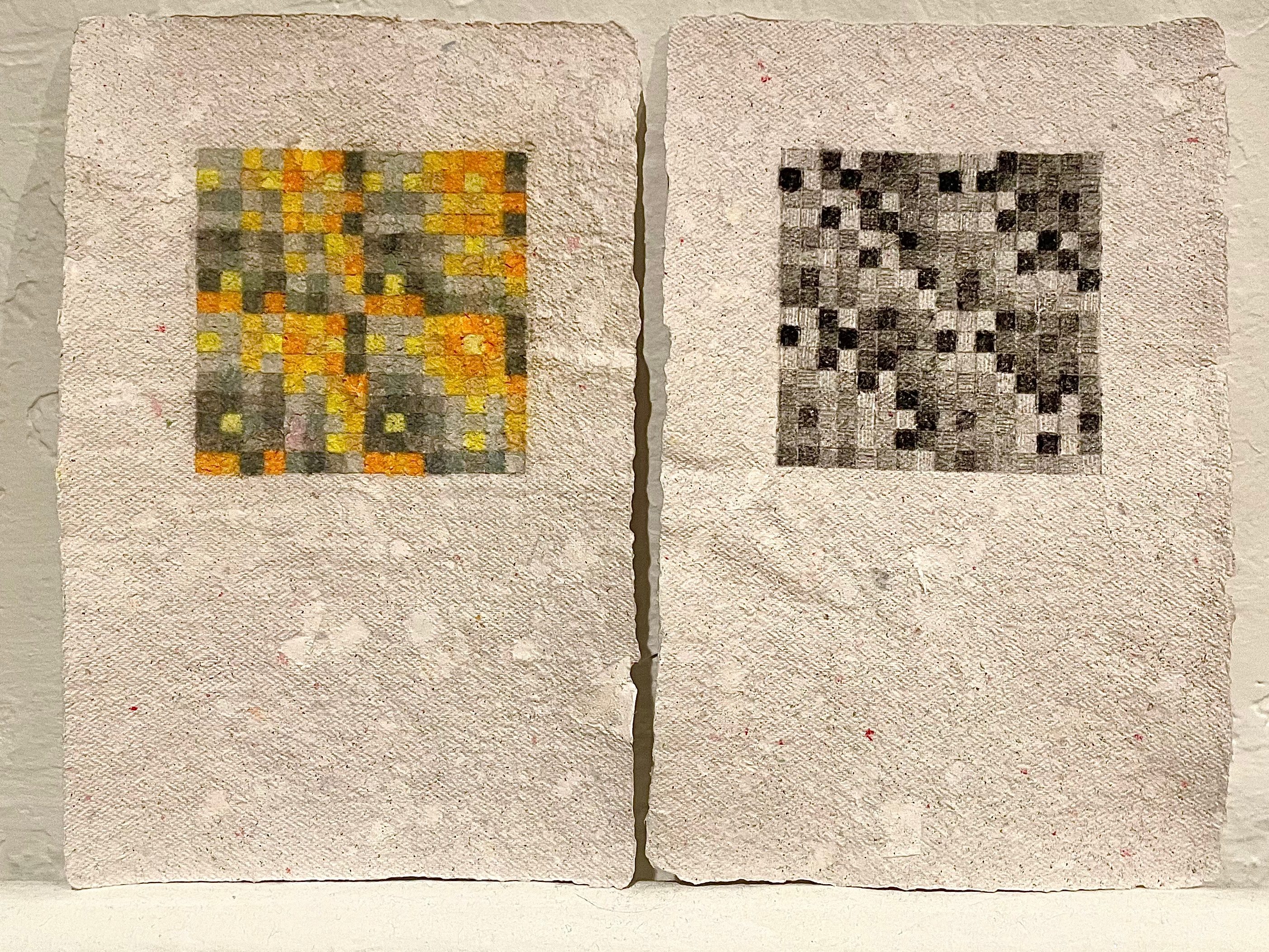 The diptych series uses matrices from twelve tone serial composition (a classical music technique developed by Arnold Schoenberg) to generate grid-based patterns from melodies. Each shaded or coloured square represents a musical pitch, the top horizontal line of which is the original melody’s sequence.