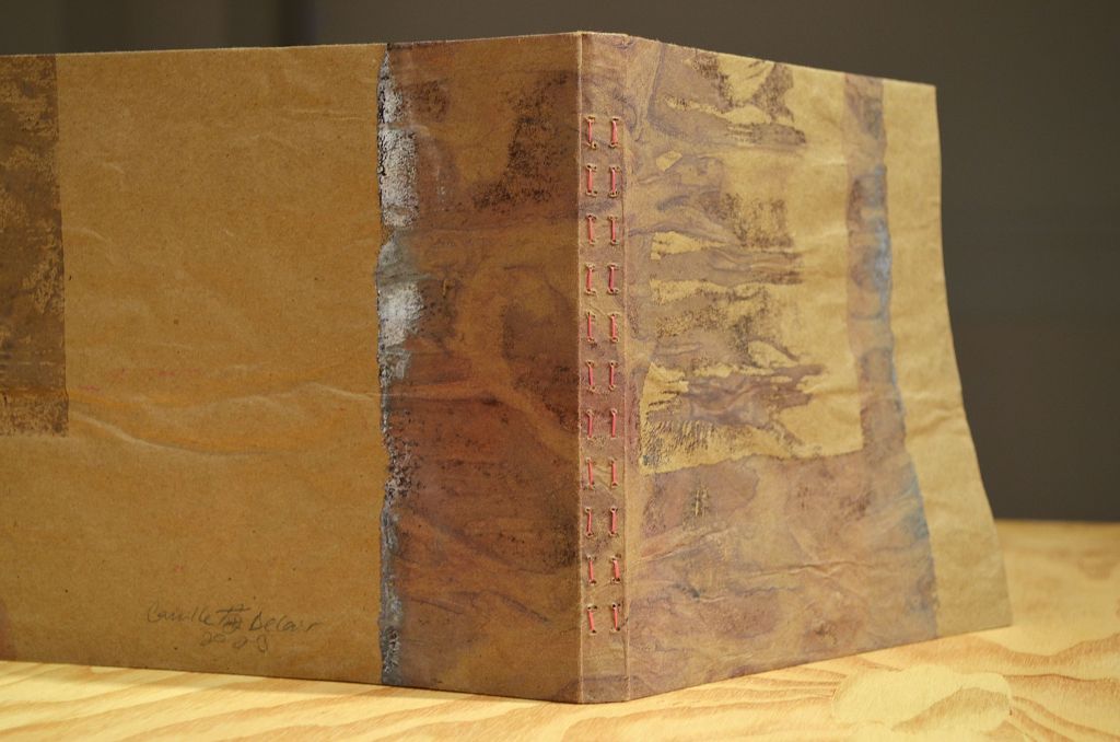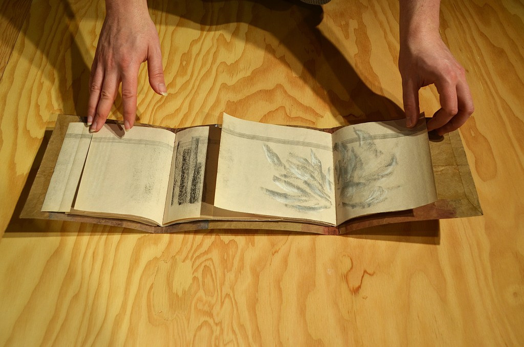 Charcoal and graphite on newsprint interior, kraft paper with ink monoprint cover, synthetic fibre binding.
